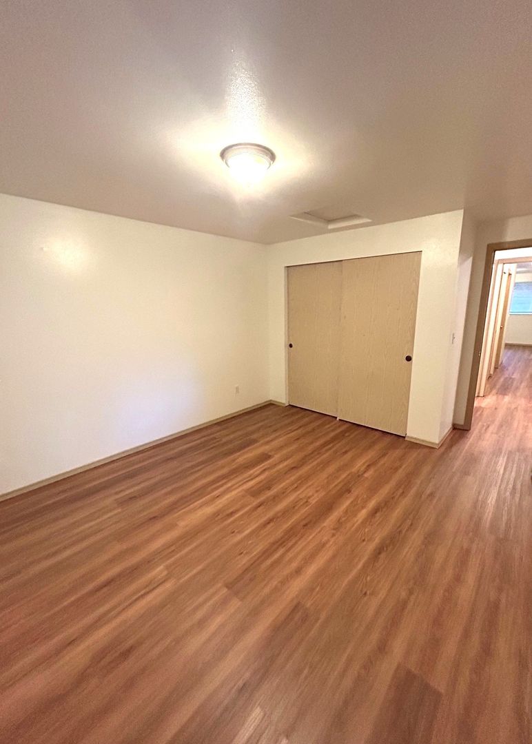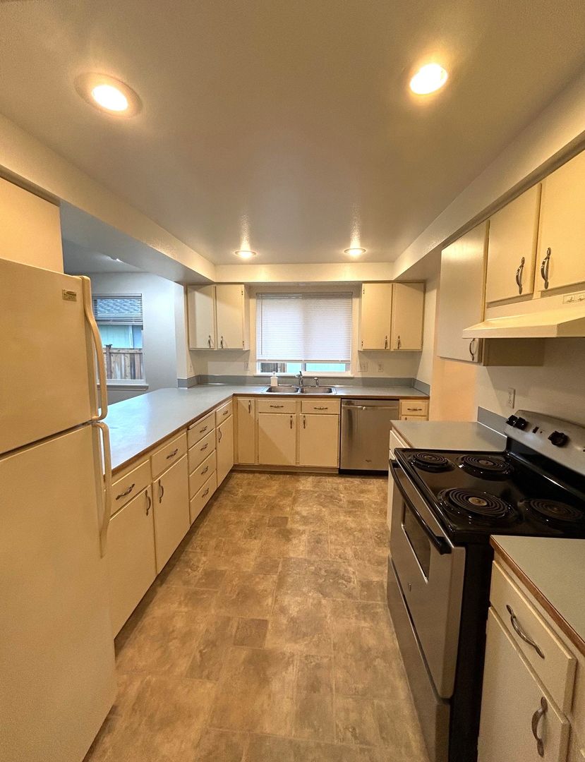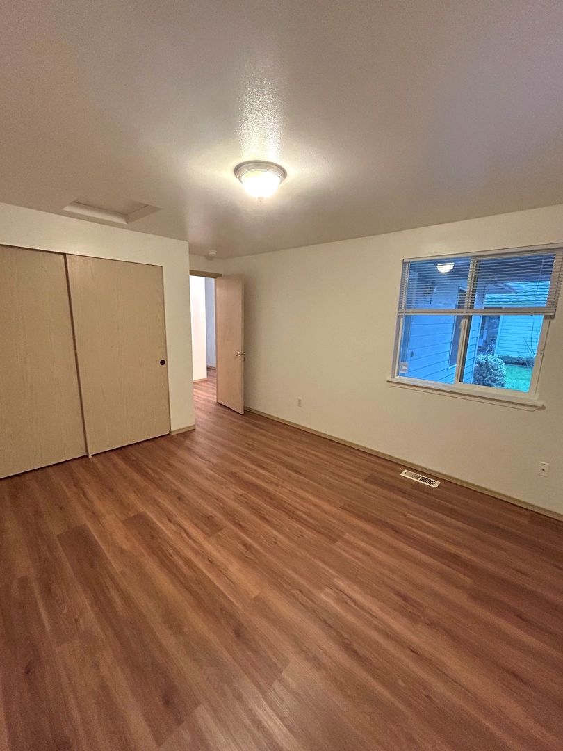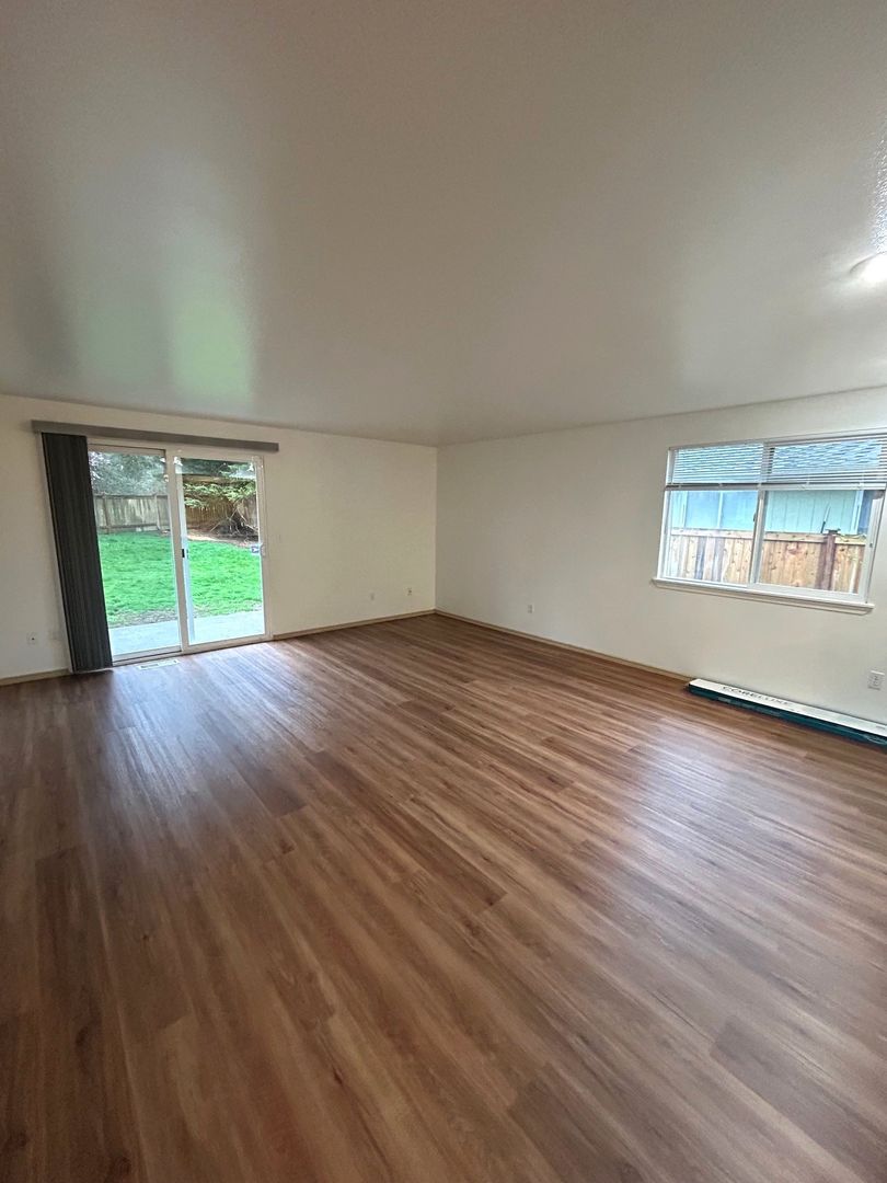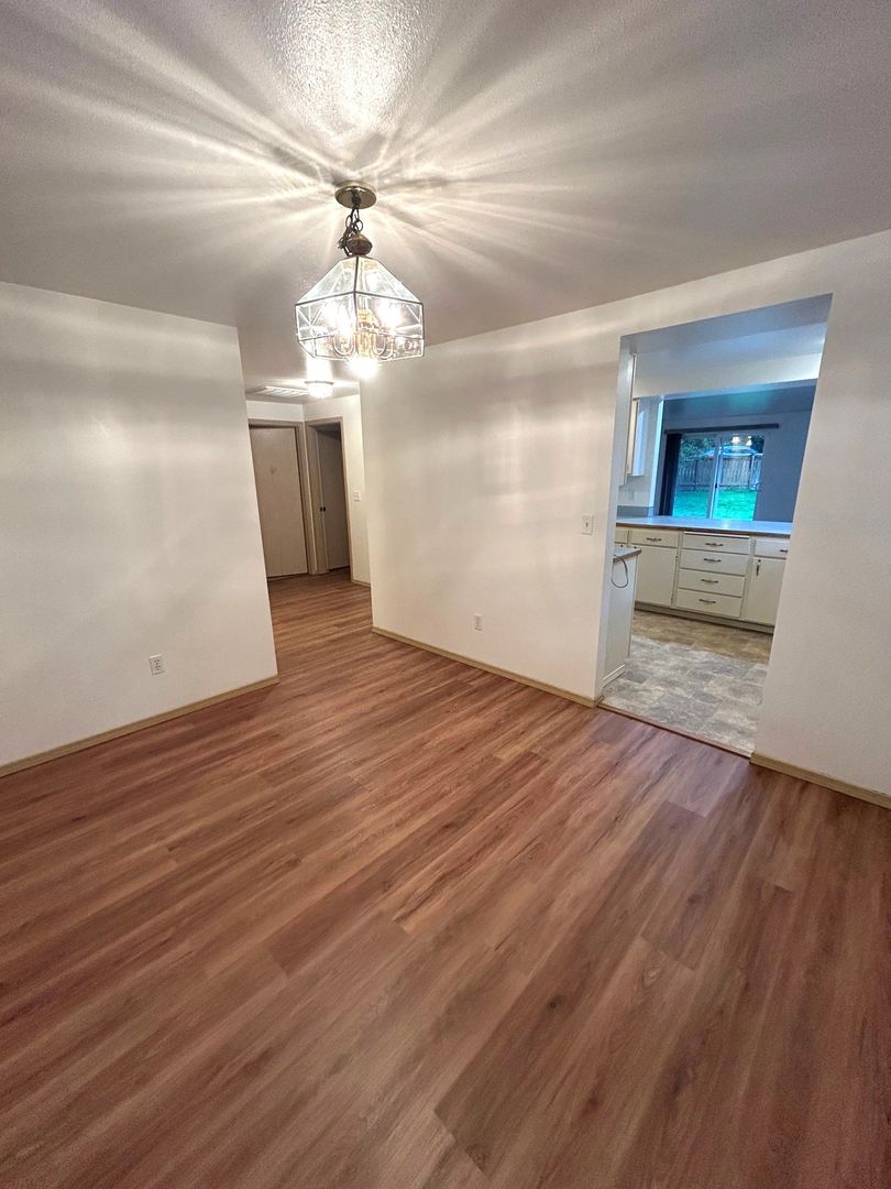 2 large bedrooms, 2 bathrooms, dining room, Kitchen opens up to Living room. Primary Bedroom has ample closet space. Fully fenced back yard, 2 car garage with washer & dryer hook-ups.